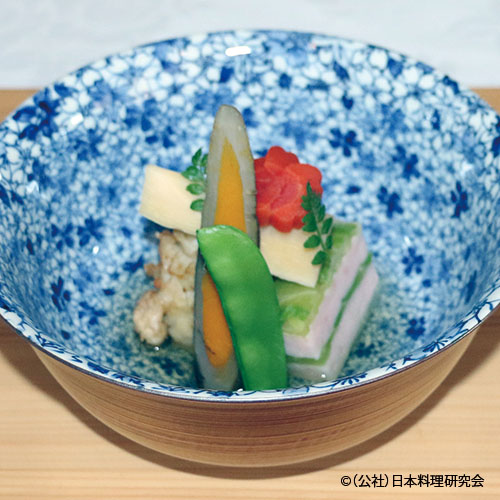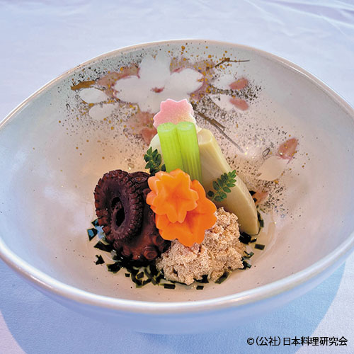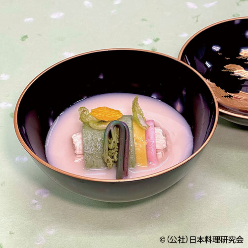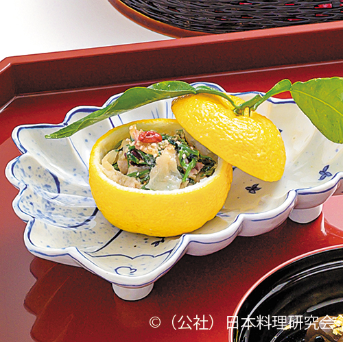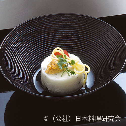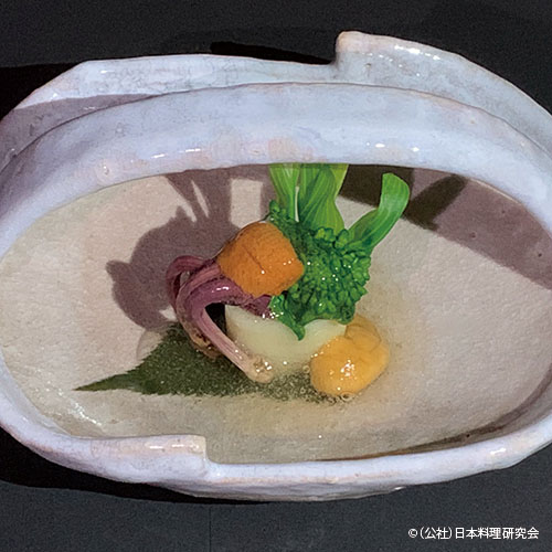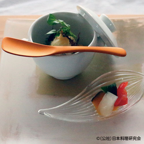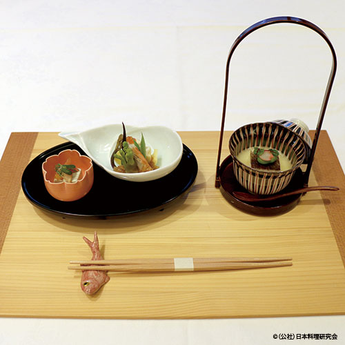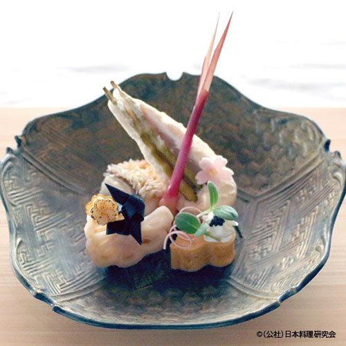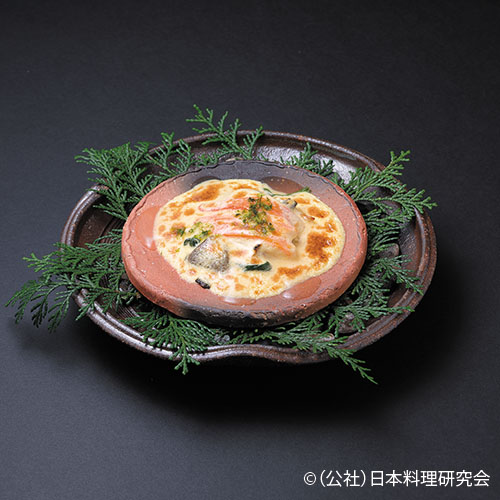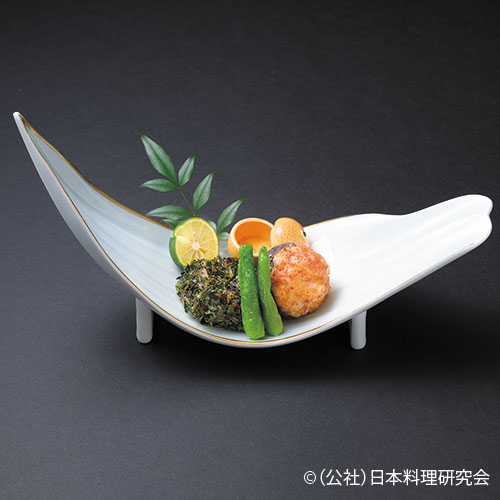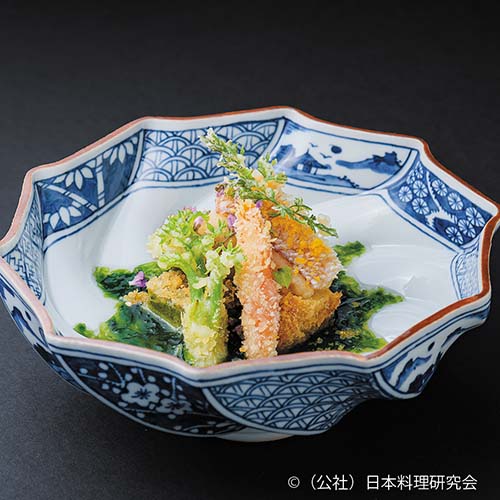 甘鯛の皮目の美しさを活かした手綱揚を紹介します。芯とする部分には車海老で作った海老糝薯とし、甘鯛のうま味に車海老のうま味を重ね合わせて美味しさの相乗効果を狙っています。