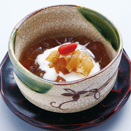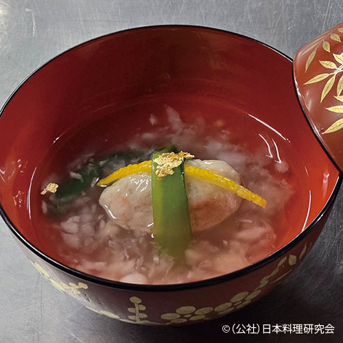料理で表現する湯河原です。御椀です。本社が北海道にあることから、北海道産ホッケ糝薯を考案しました。湯…