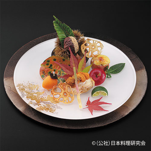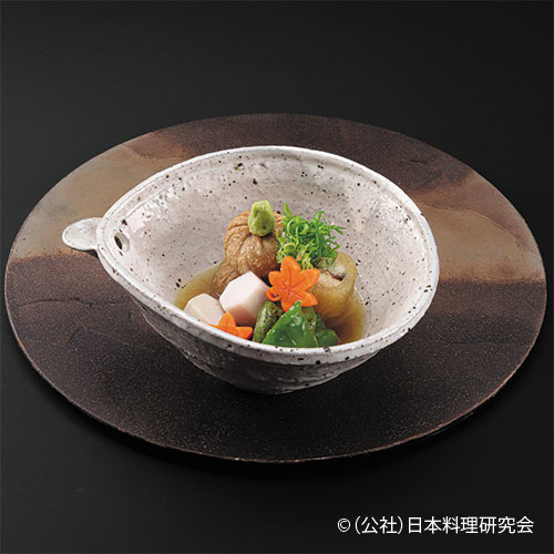 今回は、日本料理の中で、「揚物」の基本的な料理について、本多勝彦(銀座 宇 Noki)料理長の提案。料理に於いて、基本的に鱗は取り除いて料理として提供します。今回のような「鱗揚げ」は例外とも言える存在ですが、定番でもあります。生湯葉は茶巾に丸めて形を落ち着かせてから揚げますが、豆乳の風味がしっかり残る上にフワッと柔らかく仕上がるので食感も変わっていて美味しいと思います。鱗揚のカリっとした食感とのメリハリ、コントラストがこの料理のポイントになり、その食感は好評を得ています。