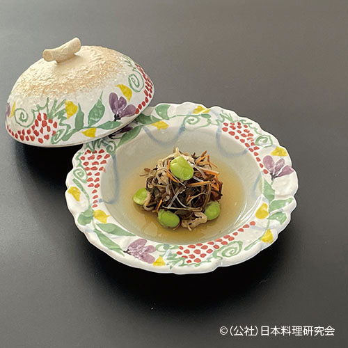 こちらは炊き合わせです。「からかい煮」も山形の郷土料理で、正月やおめでたい席で食されます。エイヒレの…