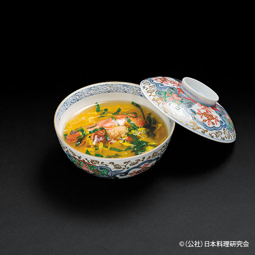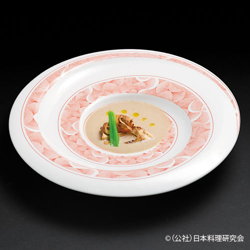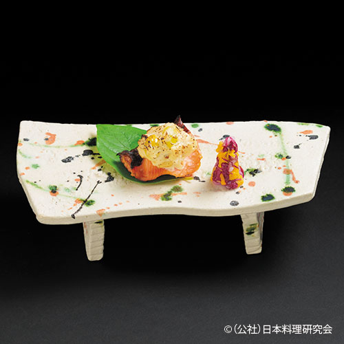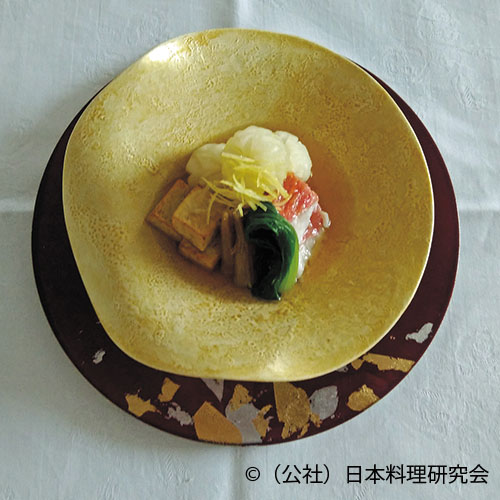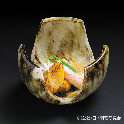 甘鯛の皮目の美しさを活かした手綱揚を紹介します。芯とする部分には車海老で作った海老糝薯とし、甘鯛のうま味に車海老のうま味を重ね合わせて美味しさの相乗効果を狙っています。