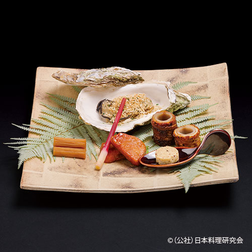 日本の白ワインに合わせた料理の紹介です。焼物です。牡蠣香草パン粉焼ですが、牡蠣は殻付きをコンベクショ…