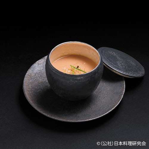 テーマ「移り変わる料理屋の仕事」から、お椀です。紅葉海老擂流しは、秋に取れる桜海老の稚魚を使います。…