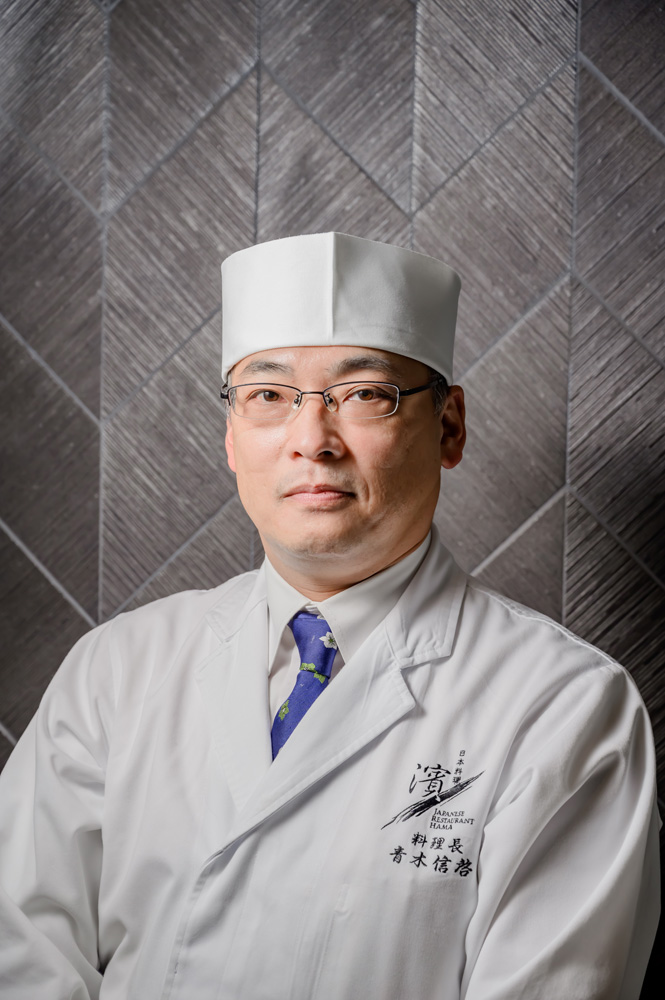 高層マンションが数多く建つ横浜・みなとみらい地区。みなとみらい駅を降りて地上に上り、パシフィコ横浜方面へ。同ホールを右手に歩を進めると、世界の要人・著名人を魅了する「ザ・カハラ・ホテル&リゾート横浜」が見えて来る。3階に上がると、広大な水庭に浮かんだ「日本料理濱」がある。料理長の青木信啓さんは、これまで首都圏の日本料理店やホテル等で修業を積み、2021年の同リゾートオープンと同時に「日本料理 濱」で料理長を務めている。