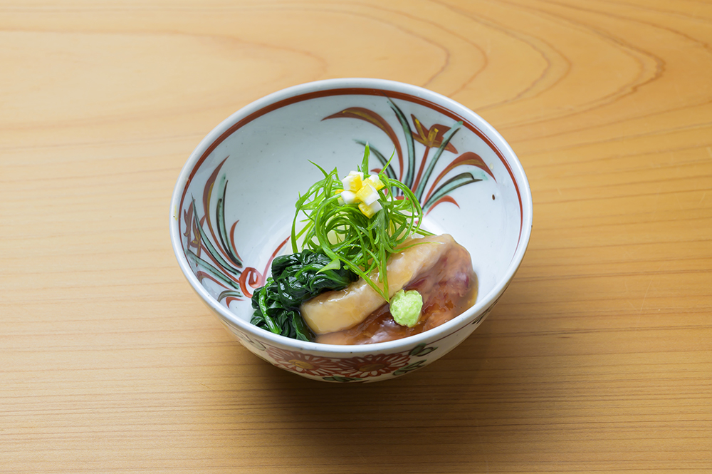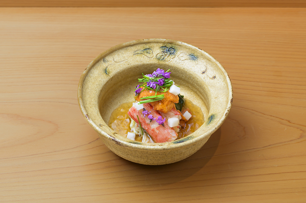松葉蟹ならではの上品な甘み、生雲丹の濃厚なクリーミーさ、若布の爽やかな磯の香りを、生姜を利かせた土佐…
